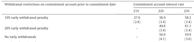 This extract from Table 3 in the paper shows the proportion of funds allocated to each type of “commitment account” when experimental participants were given a choice between an account with no liquidity constraints paying 22% interest and the commitment account.